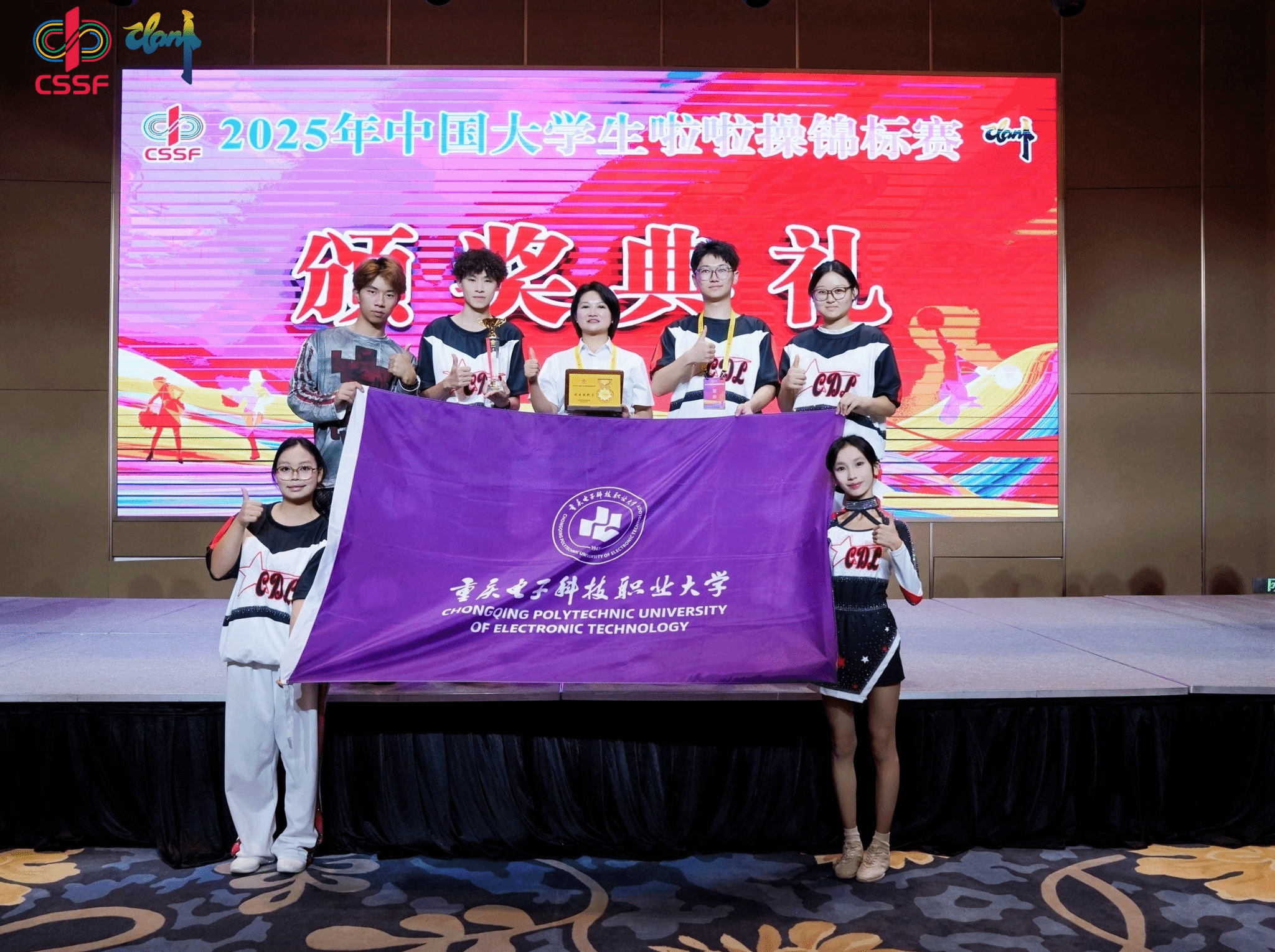 重庆电子科技职业大学啦啦操队的15名队员,在彭天娥、周盈含、曹露双、刘博源四位教练的带领下,参加了乙A组七个项目的比赛。队员们凭借扎实的功底和亮眼的表现,狂揽四项冠军,并夺得一项亚军、一项第四名、一项第五名,最终一举斩获团体冠军的至高荣誉,取得了辉煌的战绩,为学校赢得了崇高赞誉。
