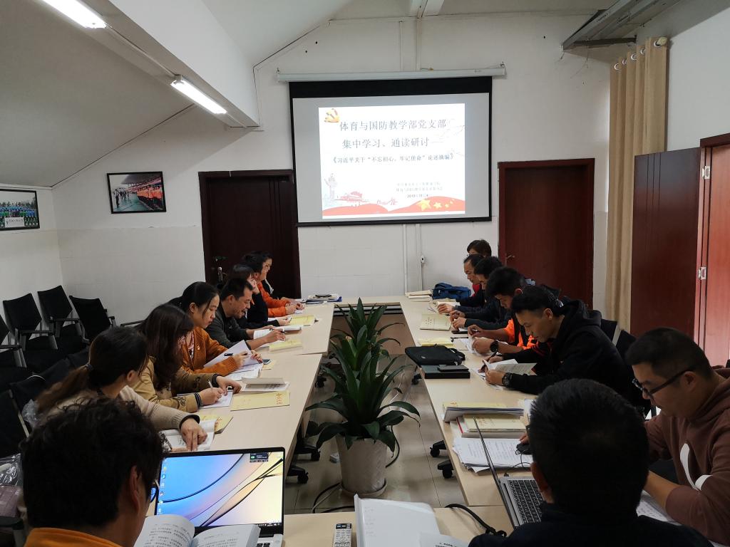 2019年11月4日中午,体育与国防教学部副部长徐然,安全管理处副处长田艾,体育与国防教学部党支部全体党员及3名入党积极分子在会议室举行集中学习,通读研讨《习近平关于“不忘初心、牢记使命”论述摘编》。会议由体育与国防教学部党支部书记孙家泽同志主持,全体支部党员佩戴党员徽章通读研讨。